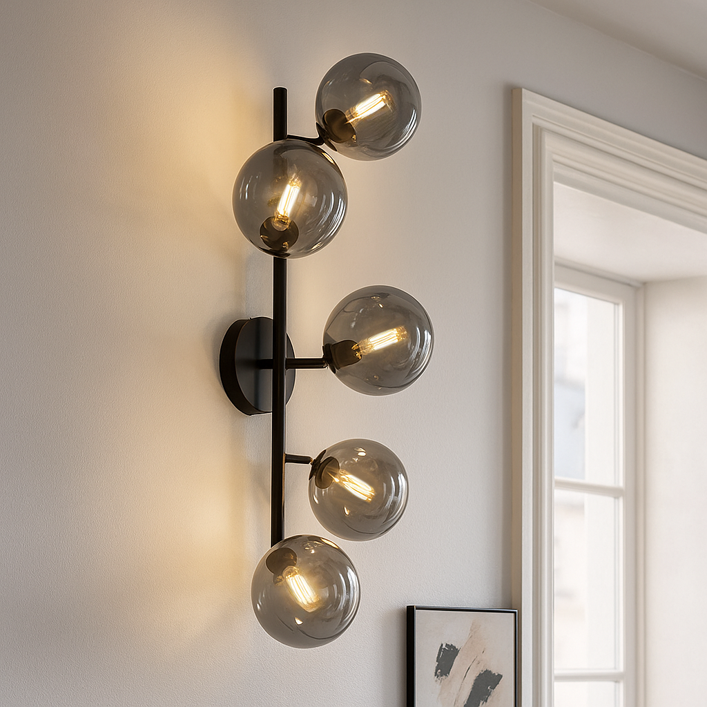 Produkt information Maksimal Watt 5 Forsyningsspænding 220-240V Antal lys 5 Sokkel G9 Produkt information Lys inkluderet Nej Bredde i cm 36 Bredde bund/monteringsplade 12 Højde i cm 60 Højde bund/monteringsplade 2.5 Længde i cm 22.5 Længde bund/monteringsplade 12 Dæmpbar Ja (ikke inkluderet) Garanti 2 år IP klassificering IP20 (støvtæt) Farve Grå, Sort Materiale Metal, Glas Stil Design Artikel nummer Q18617 - Forsiden