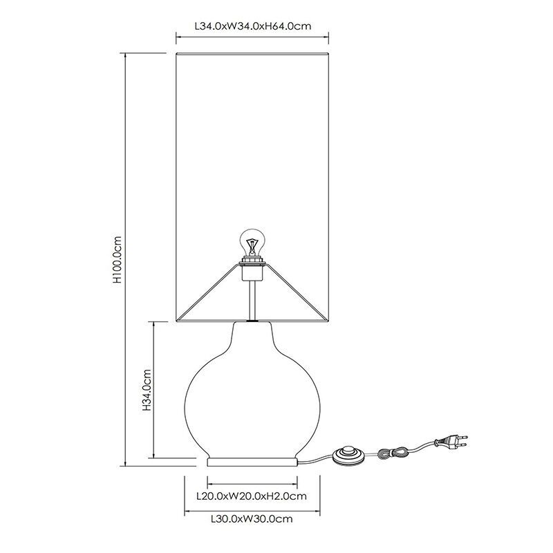 Produkt information Maksimal Watt 60 Forsyningsspænding 220-240V Antal lys 1 Sokkel E27 Produkt information Lys inkluderet Nej Bredde i cm 34 Bredde bund/monteringsplade 30 Diameter i cm 34 Diameter bund/monteringsplade 30 Vægt i KG 3.37 Højde i cm 100 Højde bund/monteringsplade 34 Kabellængde 180 Længde i cm 34 Længde bund/monteringsplade 30 Dæmpbar Ja (ikke inkluderet) Garanti 2 år IP klassificering IP20 (støvtæt) Farve Sort Materiale Stof, Glas Med afbryder Ja Med ledning og stik Ja Stil Retro Type afbryder Tænd/sluk-knap på ledningen Artikel nummer Q51178 - Forsiden